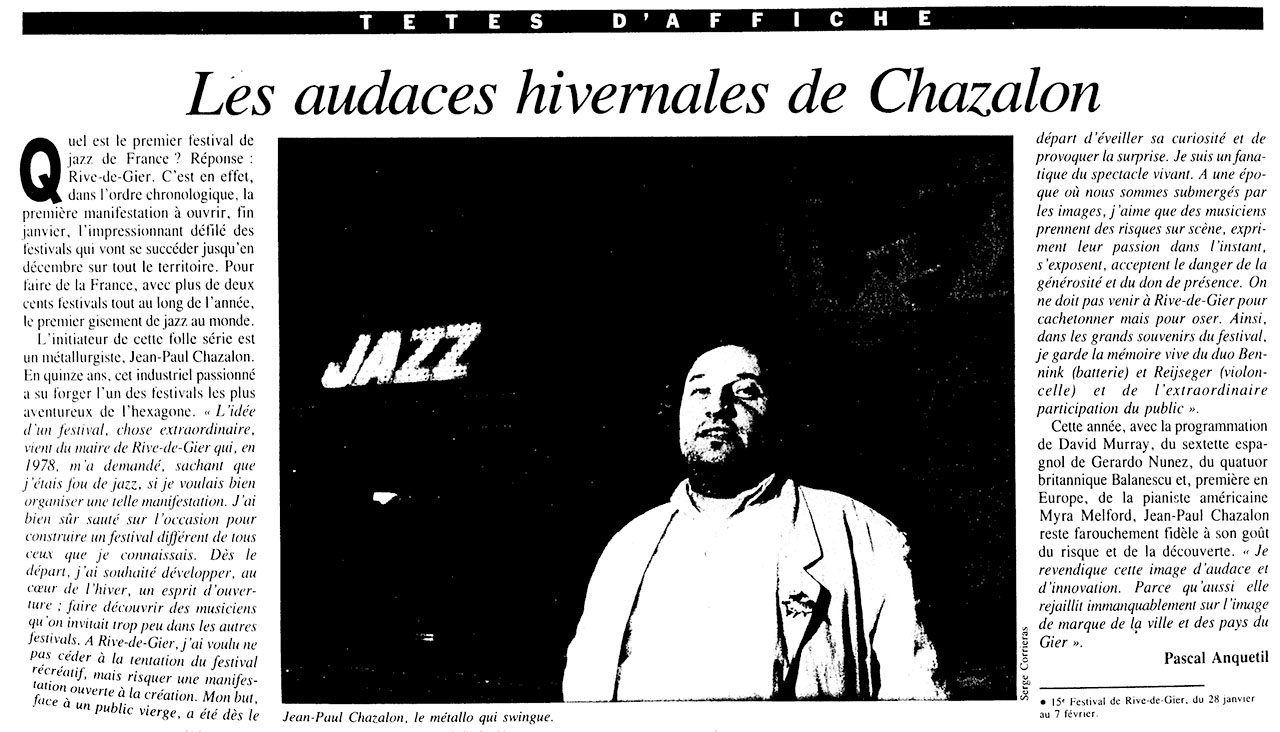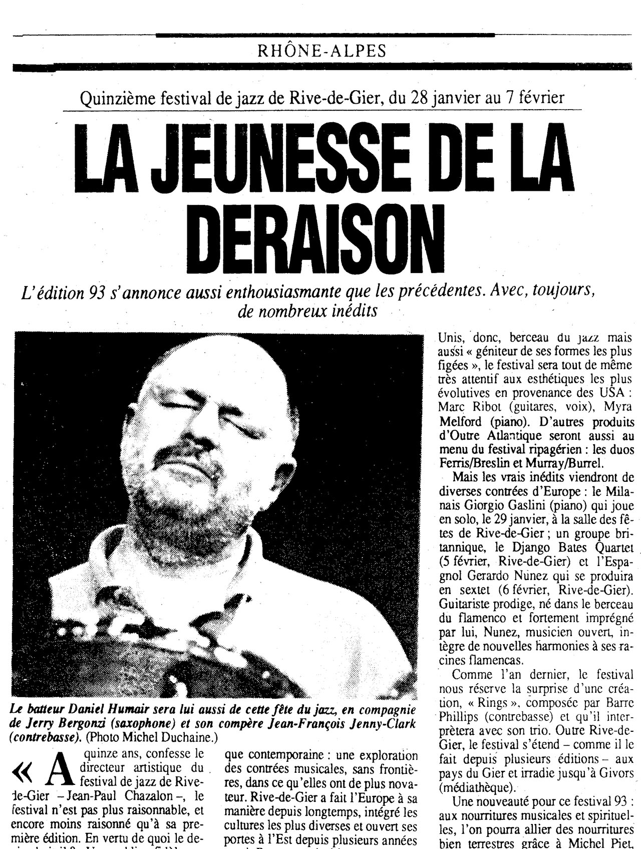 Jean-Marc Montera trio / Marc Ribot quartet / Giorgio Gaslini / Trio Humair – Bergonzi – Jenny Clark / Myra Melford trio / Steve Coleman trio / Eugenio Colombo / Dimitri Naïditch / Rings / Balanescu Quartet / Human Chain et Django Bates quartet / Marc Ducret et Seven Songs / Yves Robert et Philippe Deschepper / Duo Ferris – Breslin / Gerardo Nunez sextet / David Murray – Dave Burrell
