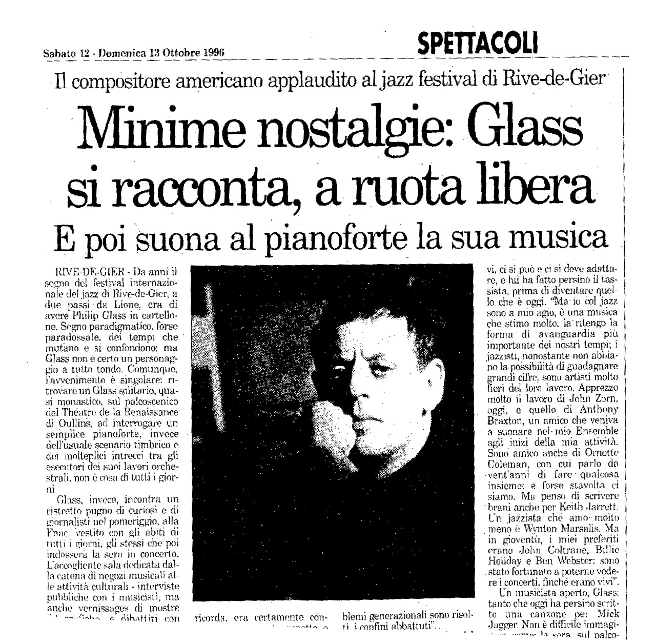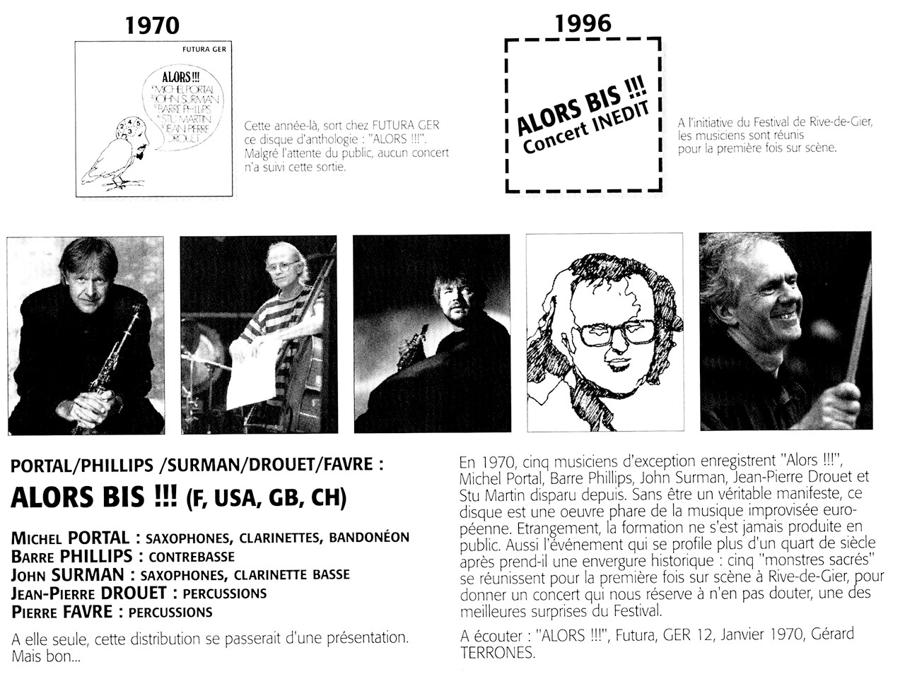Philip Glass / E’Guijecri – Mereu – Rollet – Villerd / Duo Marias / Garcia Fons / Pascal Lloret trio et solo / Pascal Frascone Quintet / Paul Bley / Newtone Experience / Momes / Movies / Noël Akchote / Brunifer / Louis Sclavis trio – solo / Alors Bis !!! Michel Portal – Barre Philips – John Surman – JP Drouet – Pierre Favre / Whisper Not : Benny Golson – Heavy Fingers / Steve Coleman and “Five elements” / Impro Soli : Gianni Gebbia – Sébastien Turnel – Débora Seffer – Jean-Pierre Drouet – Yochk’o Seffer – Miriam Palma / Ahmad Jamal / Hubert Dupont Altissimo / Marc Ducret / Dave Burell – Daniel Huck / Carmen Lundy quartet et Jean Toussaint / La Baronne / Boubouchkaïa / Atalante