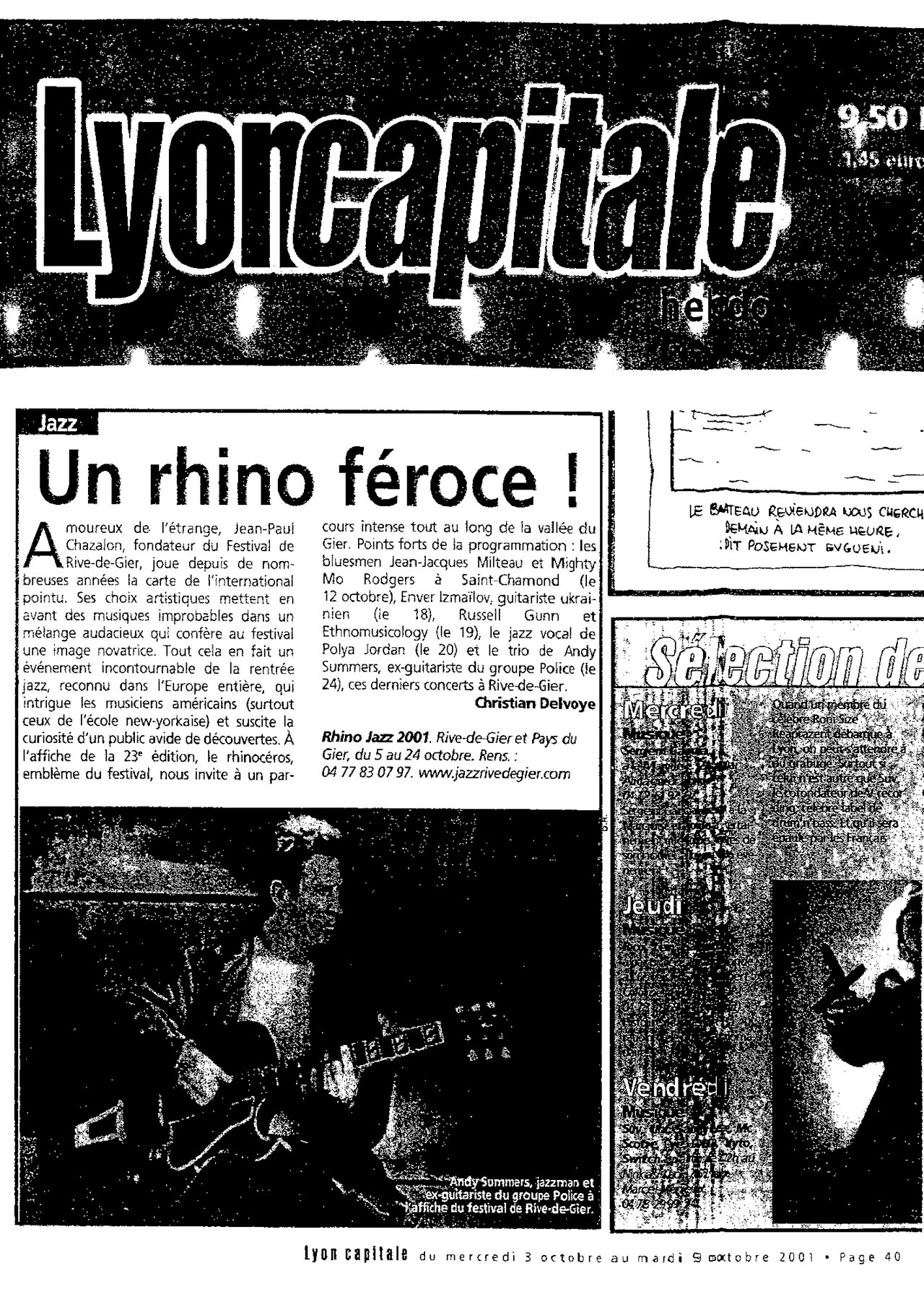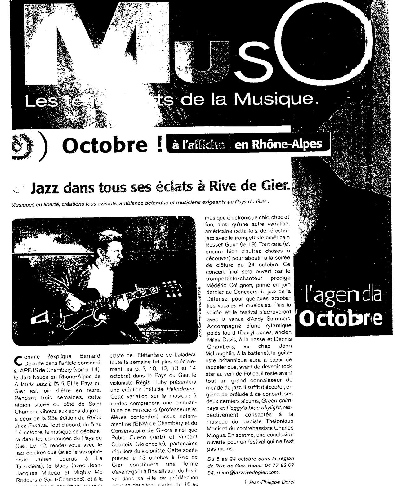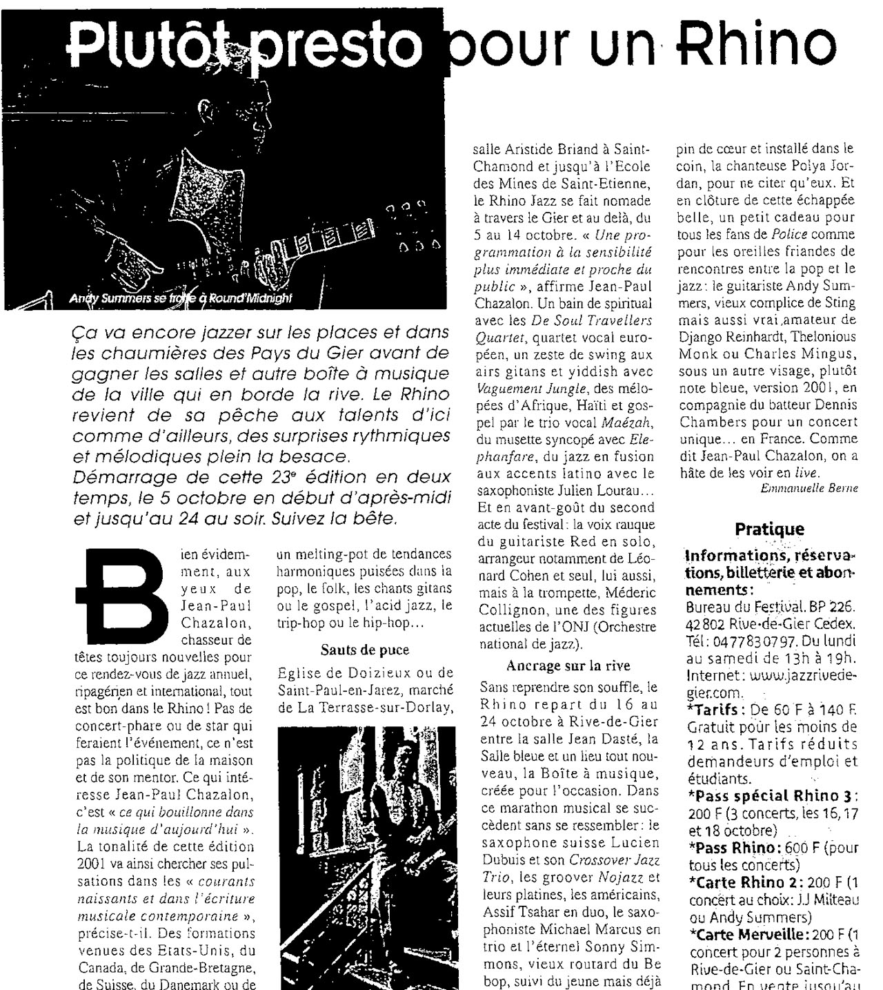 Vaguement la Jungle / De Soul Travellers quartet / Maezah / L’Elefanfare / Red solo et trio / Jazz des Lys / Wonderbrass / Tekameli / Urban Drum and Bass / Mederic Collignon / Pepa Païvinen trio / Jean-Jacques Milteau and Mighty Mo Rodgers / Julien Lourau / Paris Washboard / Patrick Saussois trio / Palindrome / J.-L. Matignier & Renaud Garcia Fons / Lucien Dubois Crossover jazz trio / Nojazz / Assif Tsahar duo / Michael Marcus trio / Sonny Simmons solo / Lionel Martin trio / Enver Izmailov solo / Spice Bones / François Bourassa trio & André Leroux / Teddy Gauliat-Pitois duo / Russell Gunn & Ethnomusicology / Takuan / Polya Jordan / Andy Summers trio / Balocello Dominique Brunier et E. Anglaret / Les Nouveaux Monstres Francioli – Bourquin