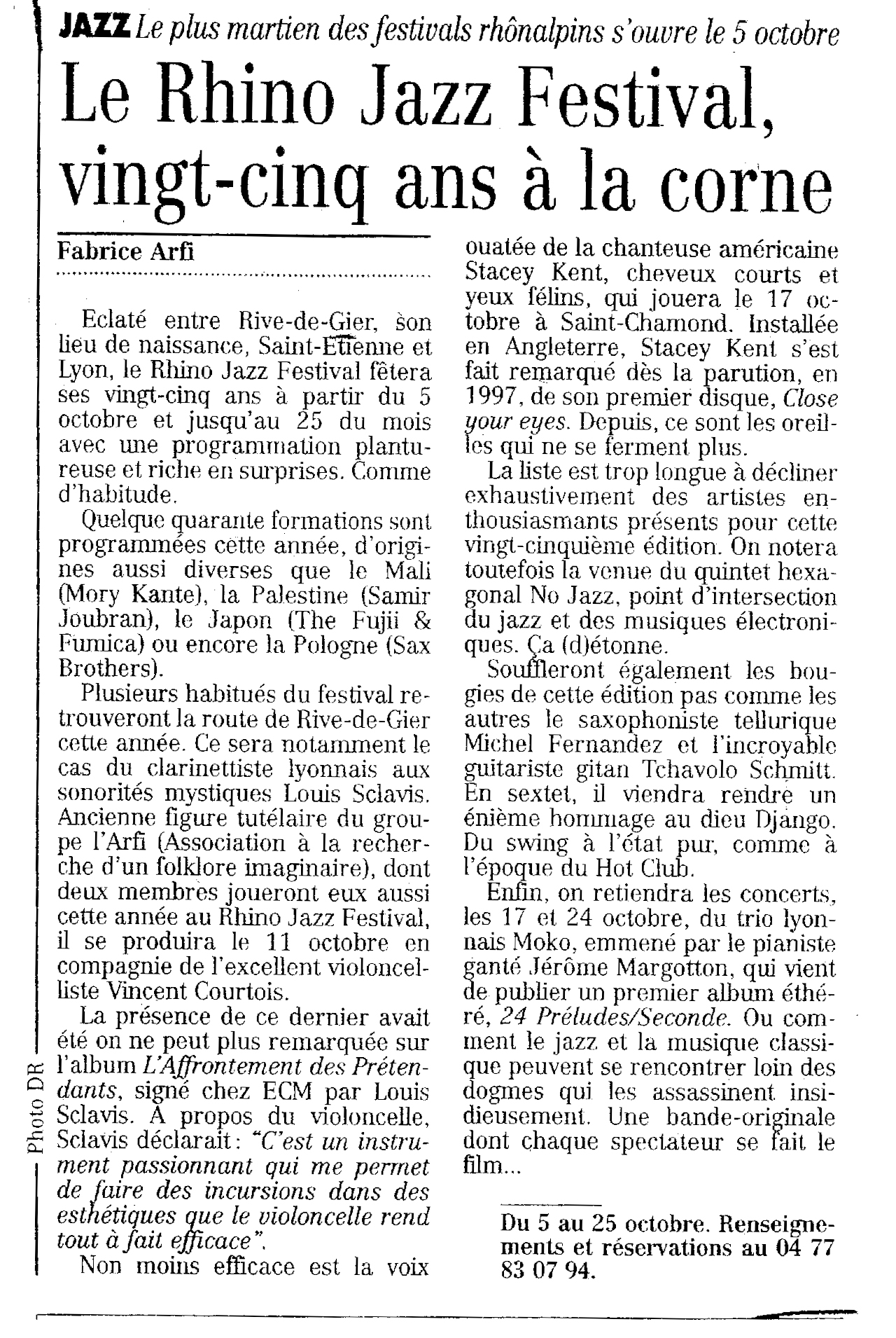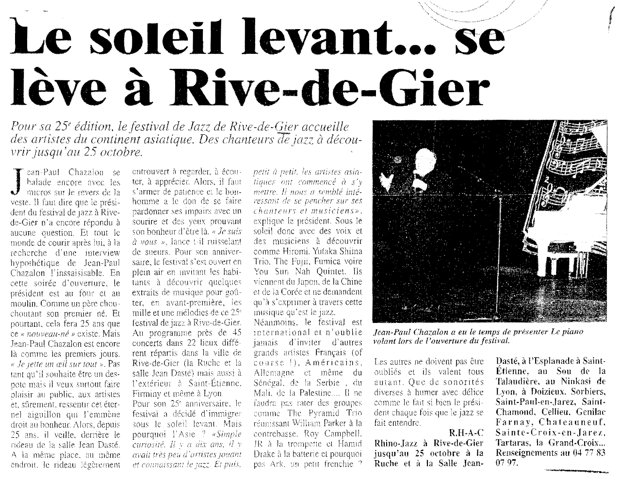 Fanfare Sonotone / Dani Lary / Les dynosaures trombones orchestra / Michael Buxton / Les Percussions Claviers de Lyon / Boban Markovic Orkestra / Yutaka Shina trio / Sinti Swing / Tchavolo Schmitt sextet / The Fuji + Fumica / Guy Villerd – Ayler project / The pyramid trio / Tobrogoï / Ark / Hocus pocus / Mory Kante / Michel Fernandez group / Hilde Kappes / Louis Sclavis – Vincent Courtois / Zhu Mang quartet / Tara Fuki / Youn Sun Nah quintet / Chris Potter quartet / Indigo / Jacky Mallerey Jazz / Hiromi / Fantazio / Stacey Kent /Jazzpel / The new Orleans Globe Trotters / Moko / Blackness / Samir & Wissam Joubran / Gospelize it ! / Sax brothers / Matt Herskowitz solo / Denis Colin trio avec Gwen Matthews / Loulou Djine / Badara Daffé / Karim Ziad / Doku / No Jazz