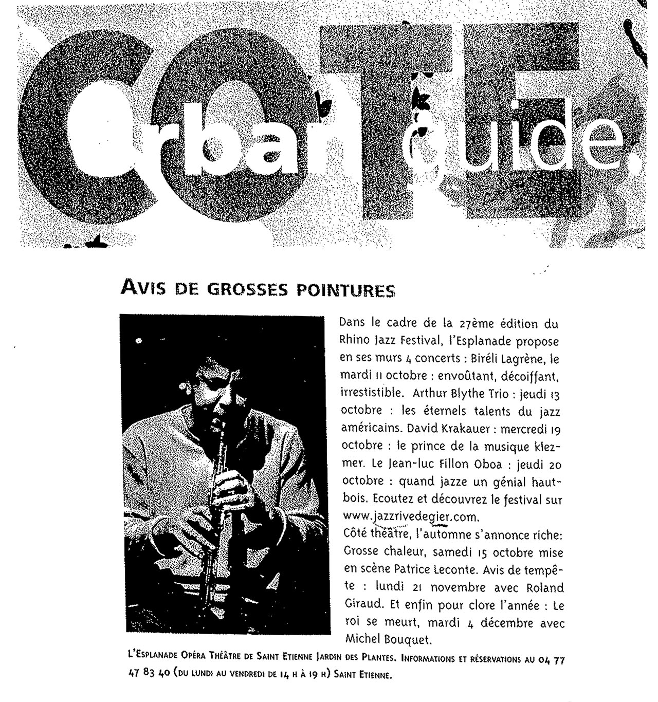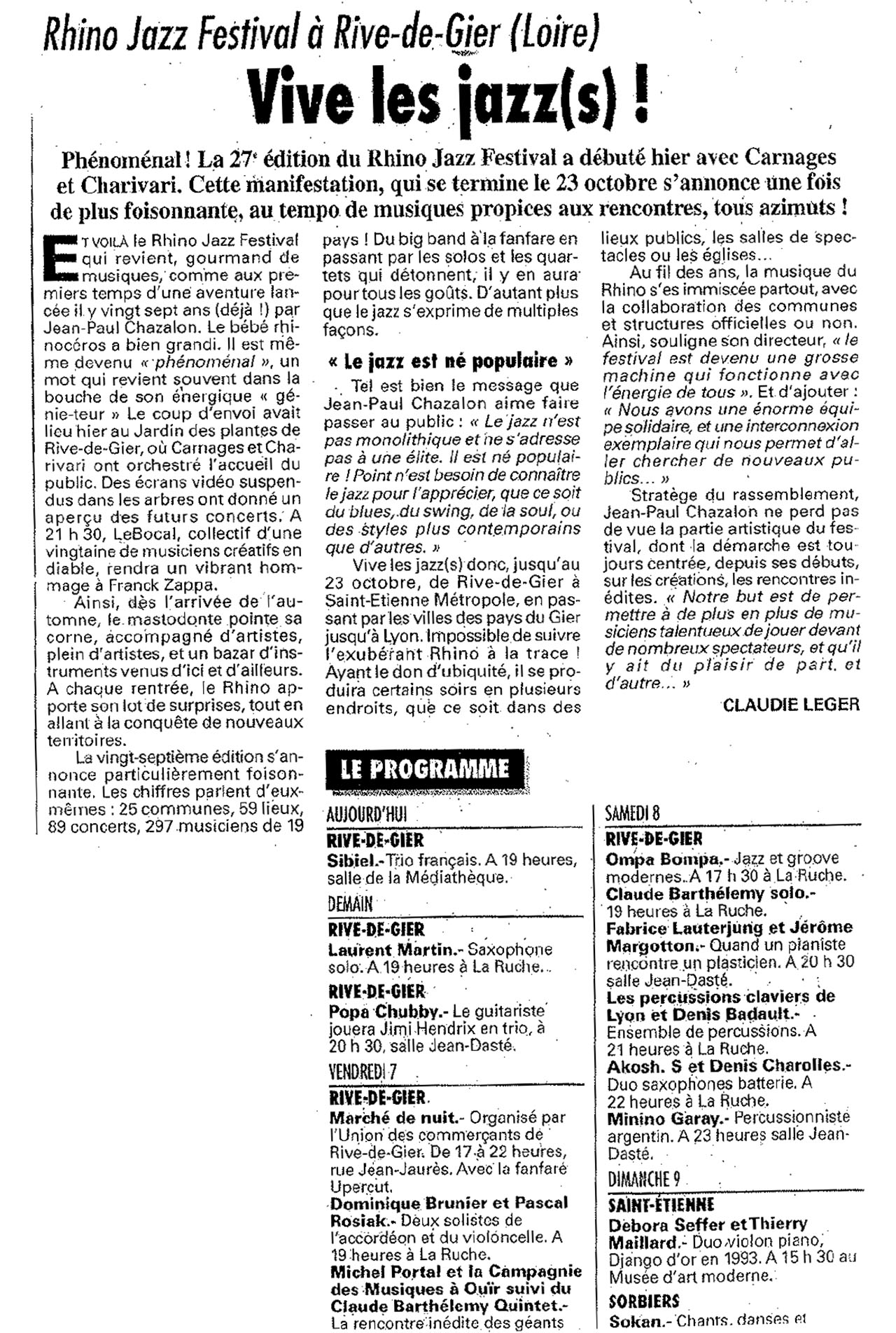Le Bocal / Sibiel / Lionel Martin solo / Popa Chubby / Fanfare Upercut / Dominique Brunier solo / Pascal Rosiak / Michel Portal rencontre la campagnie des Musiques à Ouïr / Jazzology / Ompa Bompa / Claude Barthélémy quintet et solo / Lauterjung – Margoton / PCL et Denis Badault / Akosh.S avec Denis Charolles / Minino Garay / Damien Cluzel / JazzBand / Thierry Maillard / Debora Seffer / Sokan / Bireli Lagrene / Gispy Project / John Greaves / Sophia Domancich / Nakï / Arthur Blythe duo / Bjorn Berge / Renata Rosa / Nano / Pascal Frascone trio / Swing Gones / Charlie Miller duo / Ramon Valle trio / Gospel Dream / Hilde Kappes trio / Gwen Sampe quartet / David Krakauer / Klezmer madness and Socalled / David Linx quartet & l’OSIU / La Rubia / Jean-Luc Fillon Oboa / Azoy trio / Gospel Dream / Swing Gones / El Hadj n’Diaye trio / Brad Mehldau solo / Le Hot Club de Lyon quintet