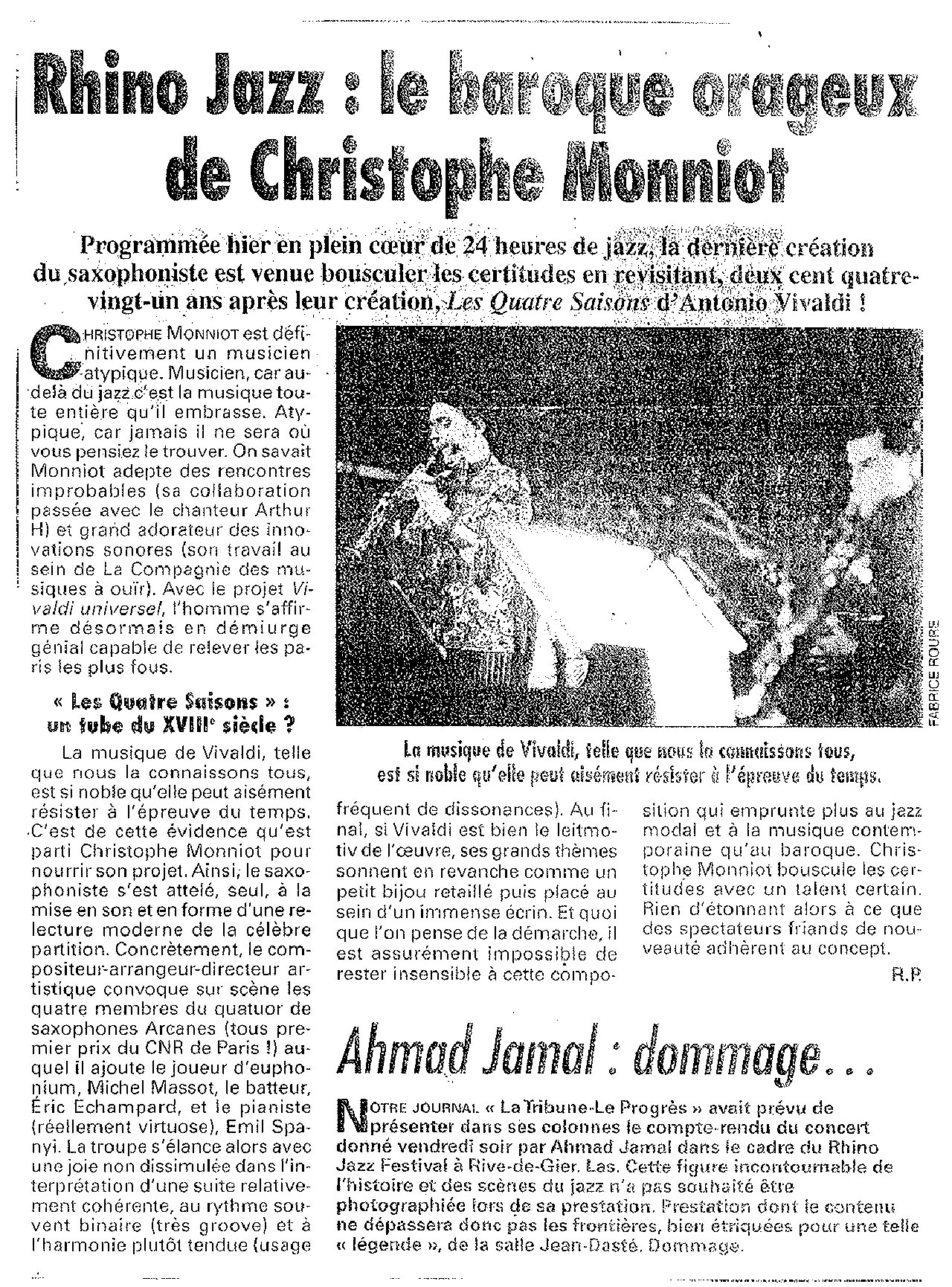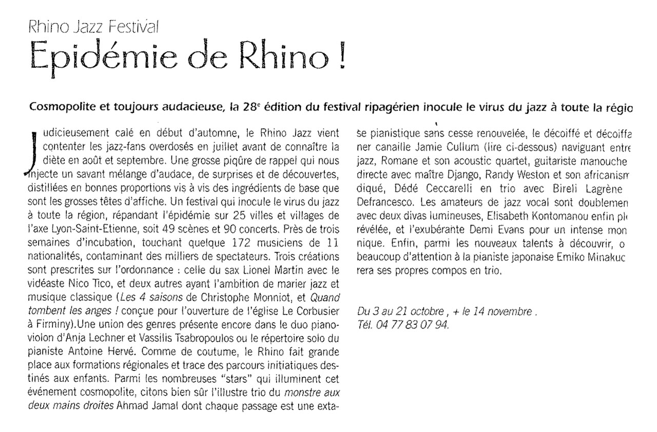 Le Bus Rouge / Lionel Martin sur un arbre perché / L’OEUF / La Basse Tonne / RedBong / Mr Hiii / Cosmik Connection / Yannick Lestra – Guillaume Menard / Demi Evans and the Hands / Miniatus / Ahmad Jamal / Les Charentaises de luxe / Anja Lechner / Vassilis Tsabropoulos / Claudia Solal / Benjamin Mousay / Les 4 saisons de Christophe Monniot / Actis band / Smith & Wesson / Dominique Brunier et Yan Volsy / Michel Mandel – Jean-Luc Rimey – Meille duo / Daniel Brothier solo / Actis Dato trio / Emiko Minakuchi trio / Romane Acoustic quartet / Aronas / Trio DuLabo / The André Café trio / Sharrie Williams / Les Raspoutines / Diana Hamilton quintet / Antonio Negro / Michel Samoilikoff trio / Craig Adams / Antoine Hervé solo / Randy Weston solo / Jean-Claude Guerre solo / Irakli / Julien Duthu – Rémi Panossian / Organ New Band / J. de Francesco – B. Lagrene – A. Ceccarelli trio / Elisabeth Kontomanou quartet / Mark Turner trio / Jamie Cullum