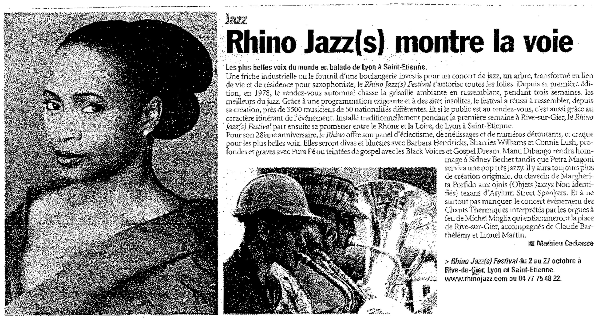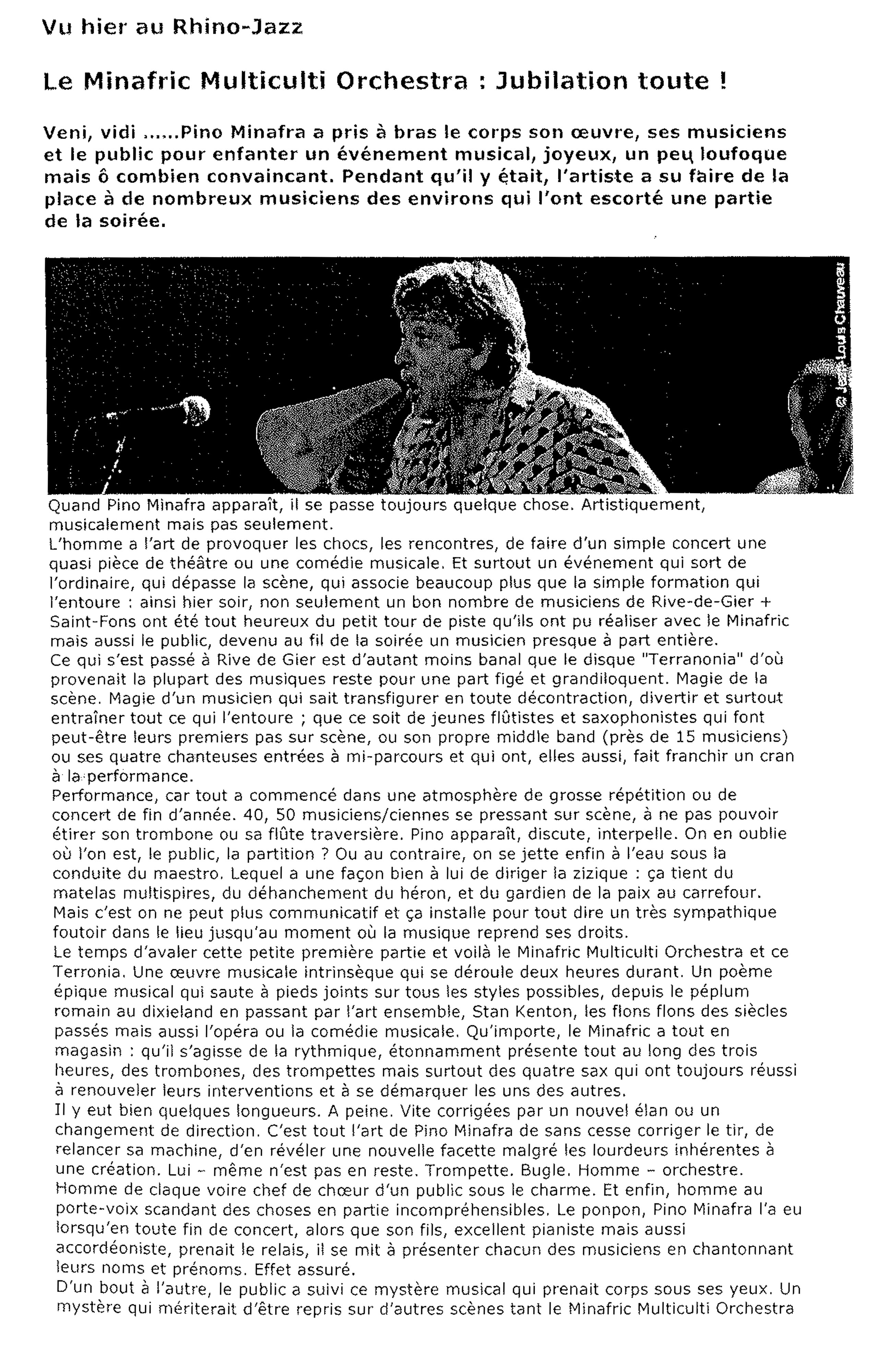 Arnoto / La belle équipe / Le Bus Rouge / Rouge ton Rhino / Le Matrice / Les mots des murs / Arnaud /Wab / Mystere Trio / Pura Fe / Yves Robert quartet / D’Ixie Et D’ailleurs / Gare aux fourmies / Motion Trio / Fantazio Gang / FM swing system / Acoustic Ladyland / Sh. Williams / Connie Lush / Juan De Lerida / Asylum Street Spankers / Kousmine Pichon / Gerard Maimone Trio / Francesco Bearzatti Trio et solo / Madou Djembe / Voodoo Skank / Manu Dibango / Black Voices / Rad / Petra Magoni / F. Spinetti / Barbara Hendricks and the Magnus Lindgeren quartet / Livio Minafra / BB Prince Bissongo / La Natchave /Terronia – Minafric Multiculti Orchestra – Pino Minafra / Margherita Porfido Solo / Claude Barthelemy Solo + Les Chants Thermiques + Lionel Martin / Mystère Des Éléphants / Jean Louis / Francesco Bearzatti Solo / Lucien Dubuis Trio / Pedram Khavar Zamini Duo / MCR trio / Gospel Young Sisters / Toutut / Actis Band / Tigran Hamasyan solo