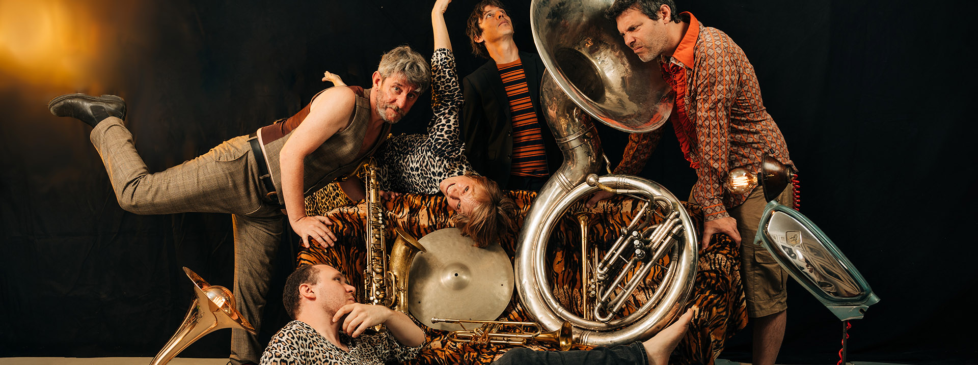 Territoire particulièrement actif en matière de jazz, la Drôme valentinoise a vu naître en 2021 cette formation comptant quatre cuivres et un batteur au nom pour le moins intrigant. Derrière ce drôle de blaze, évoquant tout à la fois le côté sauvage et confortable de cette fanfare qui combine l’esthétique du jazz moderne à la folle énergie du punk-rock et du métal, se cachent des musiciens professionnels aguerris, pour la plupart enseignants en écoles de musique et conservatoires. À l’origine de ce projet original et décoiffant, le trompettiste Léo Jeannet (Panoramic Project, Bigre!, Aquarius Orchestra) associé pour les compositions à la saxophoniste Gaby Schenke (jazzwoman allemande réputée pour son groove), et qui ont été rejoints par une seconde trompette avec Valentin Meylan venu du célèbre band lyonnais Babylon Circus, le soubassophone d’Éric Exbrayat (ex bassiste issu du punk alternatif), et la batterie de Nicolas Serret (Zebracorde, Inua, mais aussi membre du Magnetic Orchestra et du Michel Fernandez 4tet, deux groupes déjà présentés au Rhino). On comprend alors mieux la griffe de ces fauves qui aiment rien plus que de mélanger les codes pour brouiller les pistes dans des compos audacieuses, ensauvagées juste ce qu’il faut et en tout cas rageusement ficelées. Ou comment transformer le salon dominical en cabaret sauvage. Oh mon bon Georges, ça va brasser en Cellieu !…